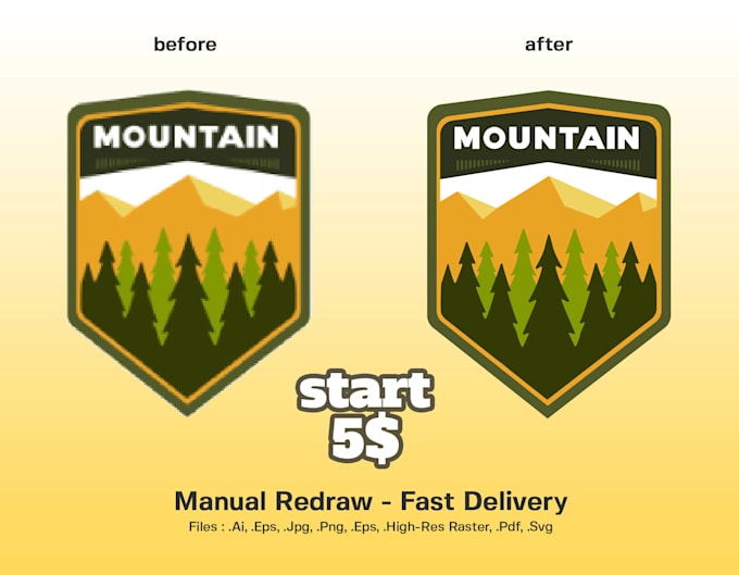 For only $5 I will manually recreate your image in vector (Adobe Illustrator) and deliver your Hi-res image with vector (SVG, EPS, Ai) & source file (Ai) ASAP.